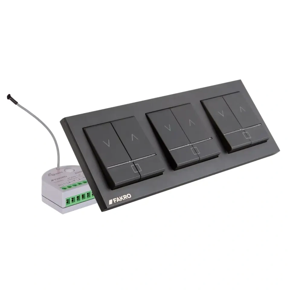 Mit dem ZWL3 Wandschalter steuern Sie drei Z-Wave-Geräte separat oder verwalten bis zu 231 smarte FAKRO Geräte in Gruppen – ganz bequem per Funk. Der Schalter besteht aus einem hochwertigen Dreifachwandschalter und einem Funkmodul zur Unterputzmontage.